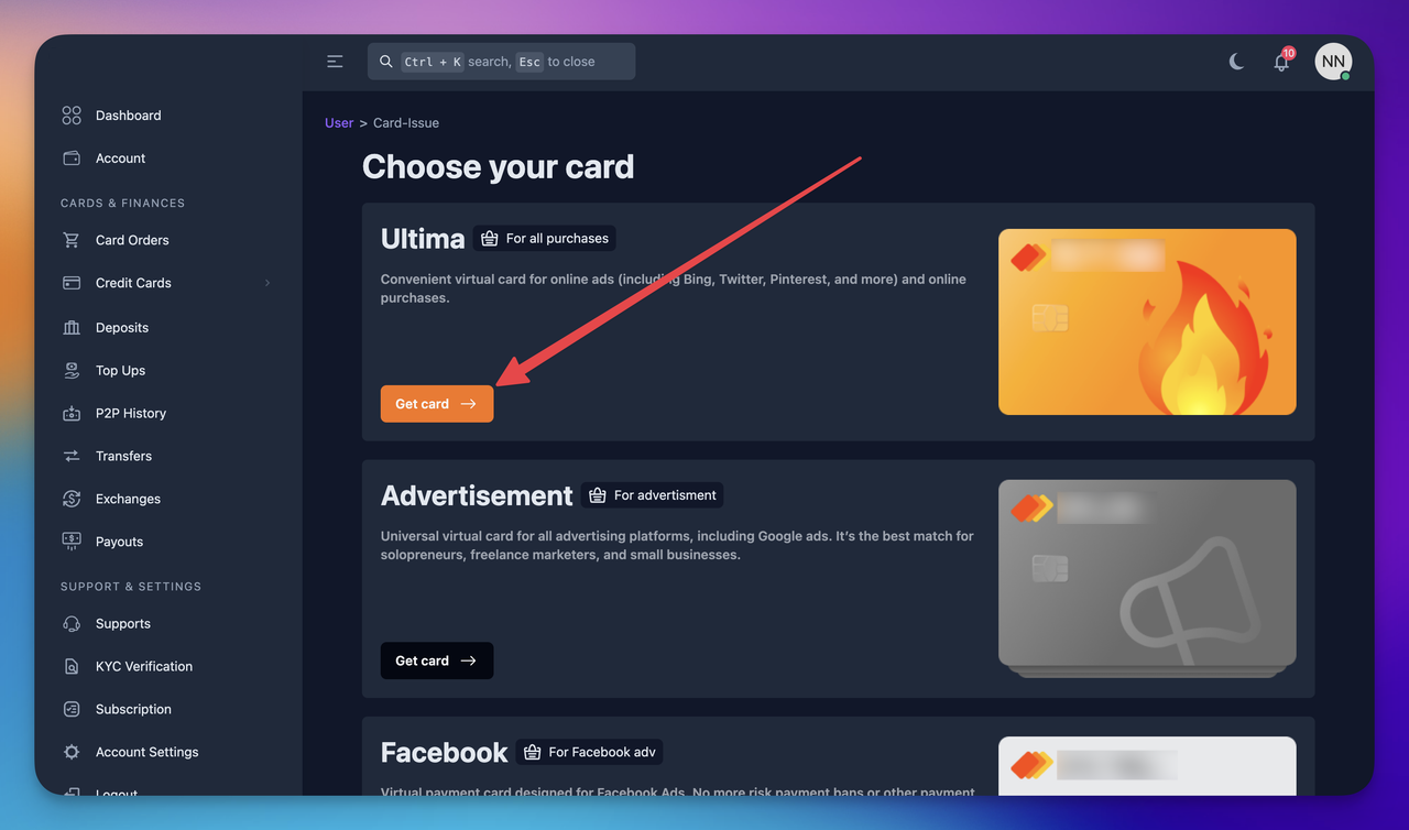 - Choose a card and click Get card button